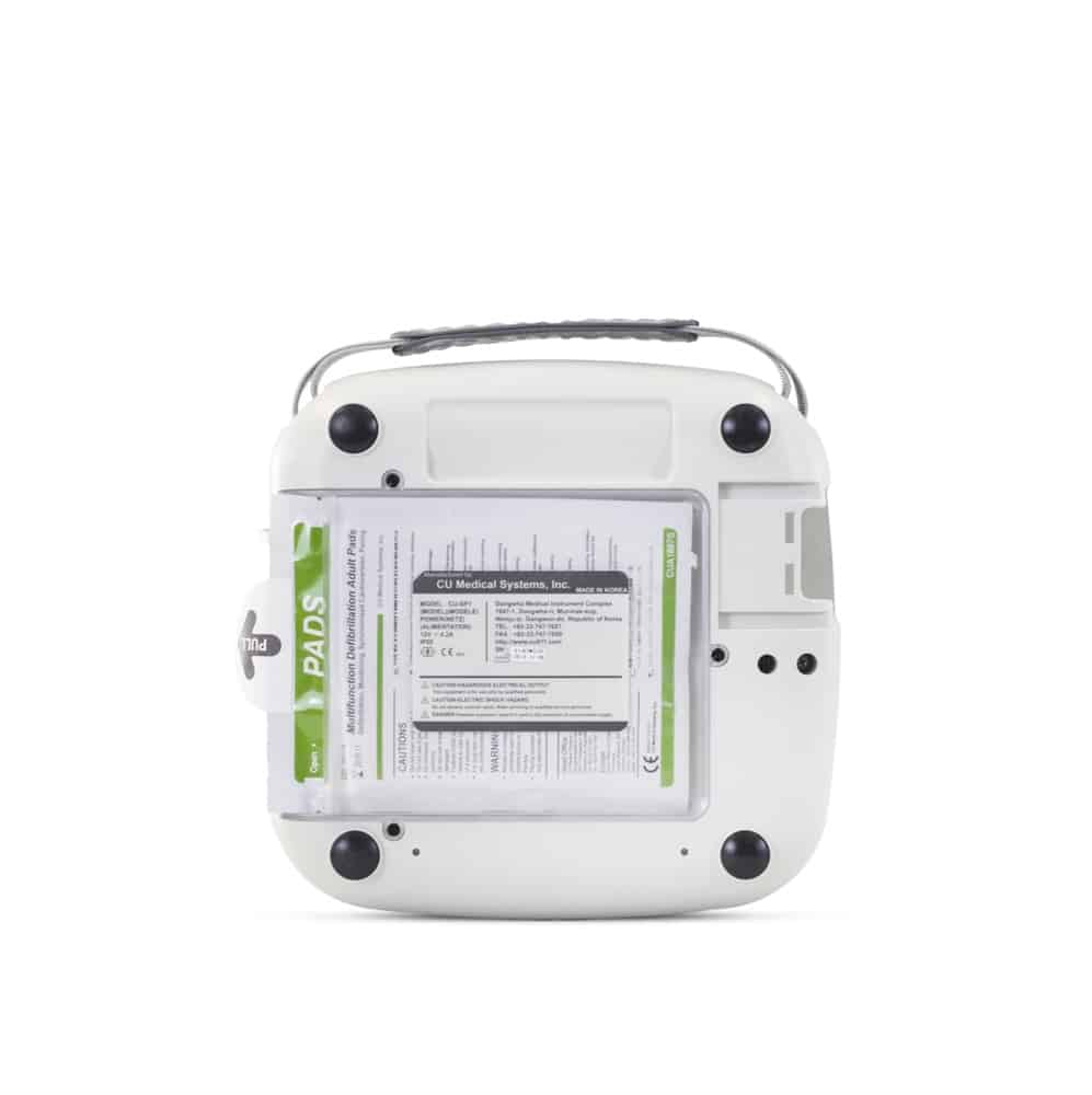 Integrated pad storage – electrode pads are stored, pre-connected, in a clear compartment on the underside of the unit